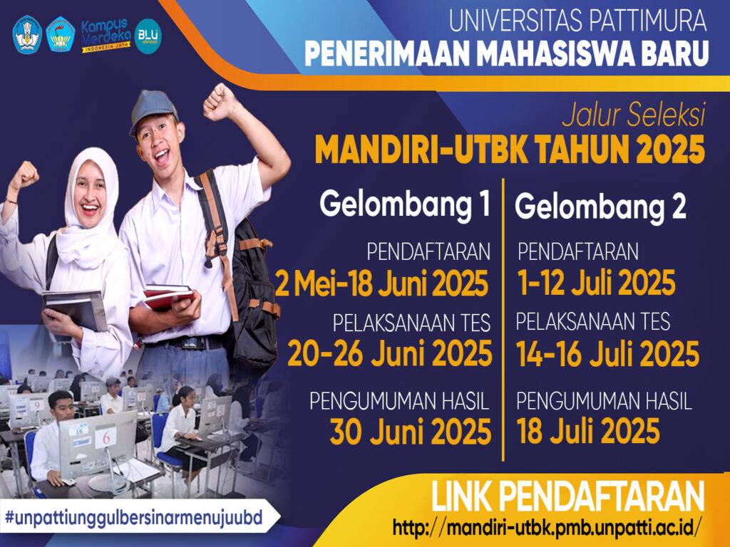 Pembukaan Penerimaan Mahasiswa Baru Jalur Mandiri UTBK Tahun 2025 Date: Friday, 02 May 2025Time: 12:00 - Location: Universitas Pattimura Facebook Twitter WhatsApp Pinterest